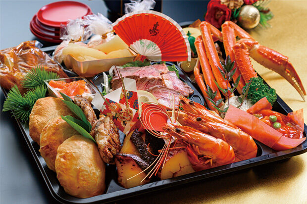 ●ちょっと大きめずわい蟹●いけだ牛ローストビーフ黒胡椒風味●いけだ牛十勝ワイン風味シチュー●十勝産ポーク叉焼●海老チリソース煮●鮭手まり蒸し●スモークサーモンクリームチーズ和え●道産鶏のコンフィ●帆立貝パイ包み焼き●数の子十勝ワイン漬け●紋別産帆立ステーキ●銀鱈西京漬け●海老姿煮●道産天然ぶり唐揚げマリネ●有精卵を使った伊達巻●丸十檸檬煮●黒豆艶煮他