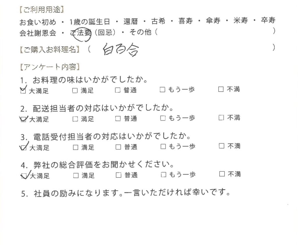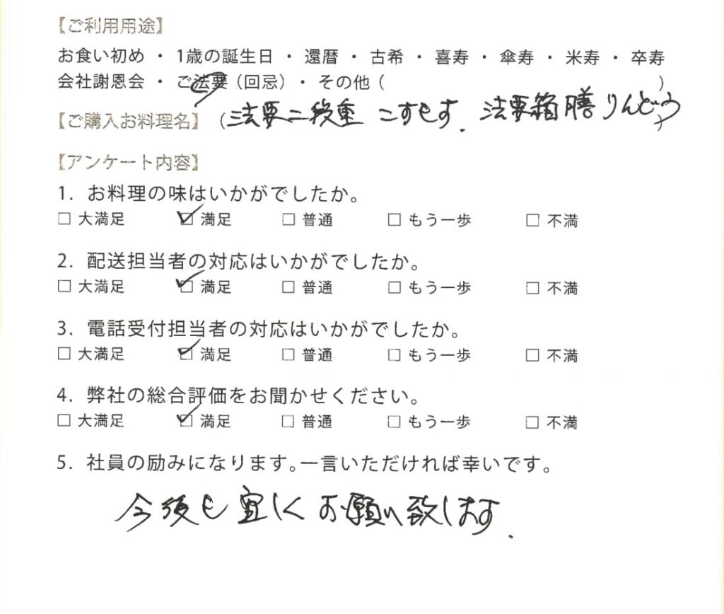 お料理の味はもちろん、箱等素晴らしく、立派な法要ができ感謝しています。ありがとうございました。 (・・・続きはこちら)